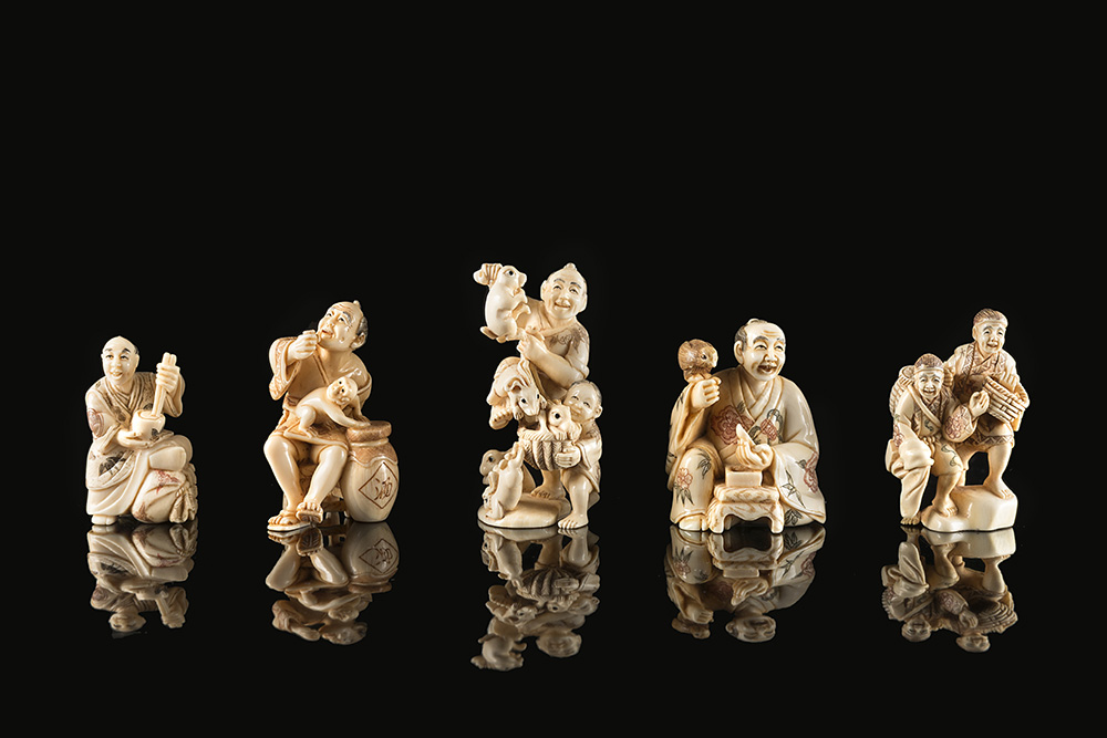 Cinque netsuke in avorio, di cui uno non firmatoGiappone, periodo Meiji...