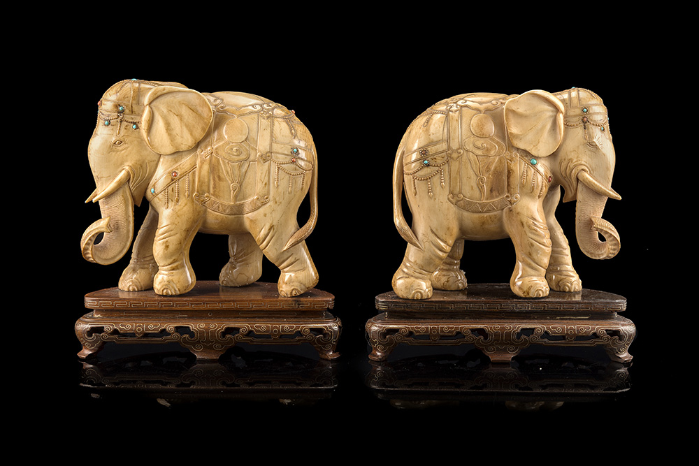 Coppia di elefanti in avorio decorati con pietre dure con basi legnoCina,...