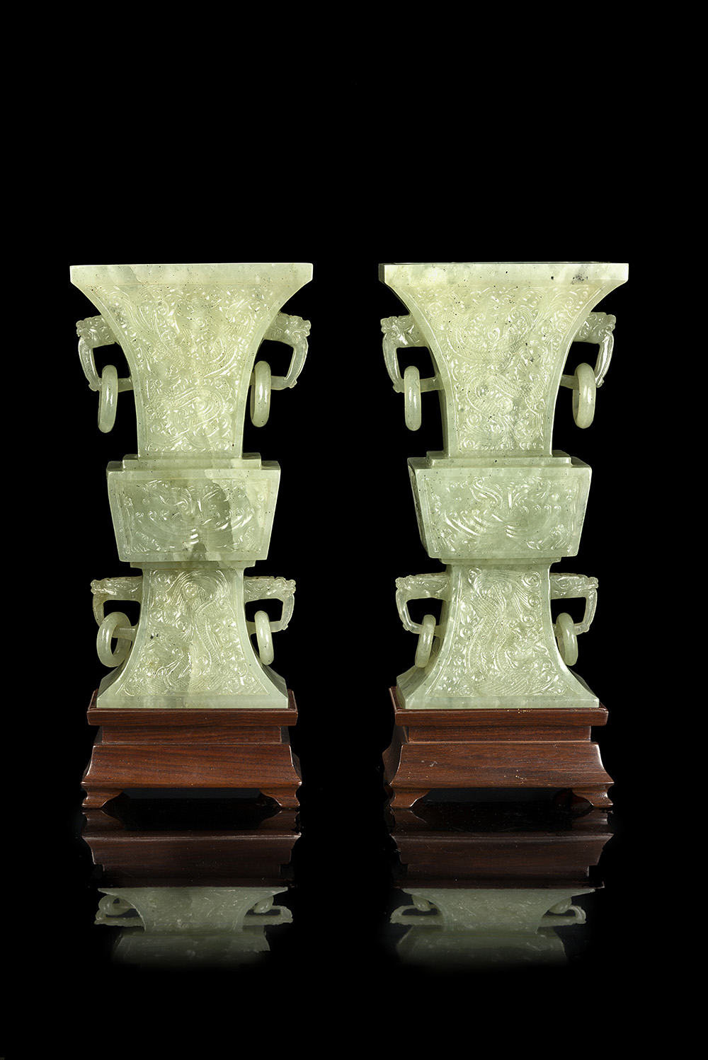 Coppia di vasi in pietra dura dalla forma arcaica, con basi in legnoCina,...