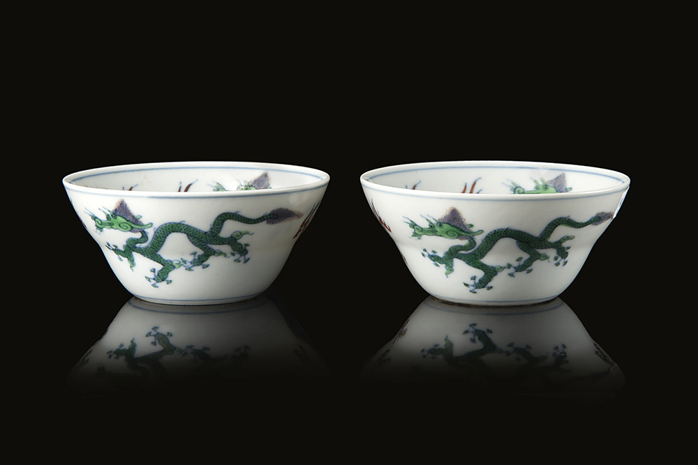 Coppia di coppette in porcellana doucai decorate con coppie di draghi,...
