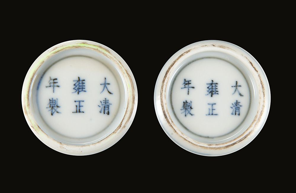 Coppia di coppette in porcellana doucai decorate con coppie di draghi, marchio apocrifo Yongzheng alla base