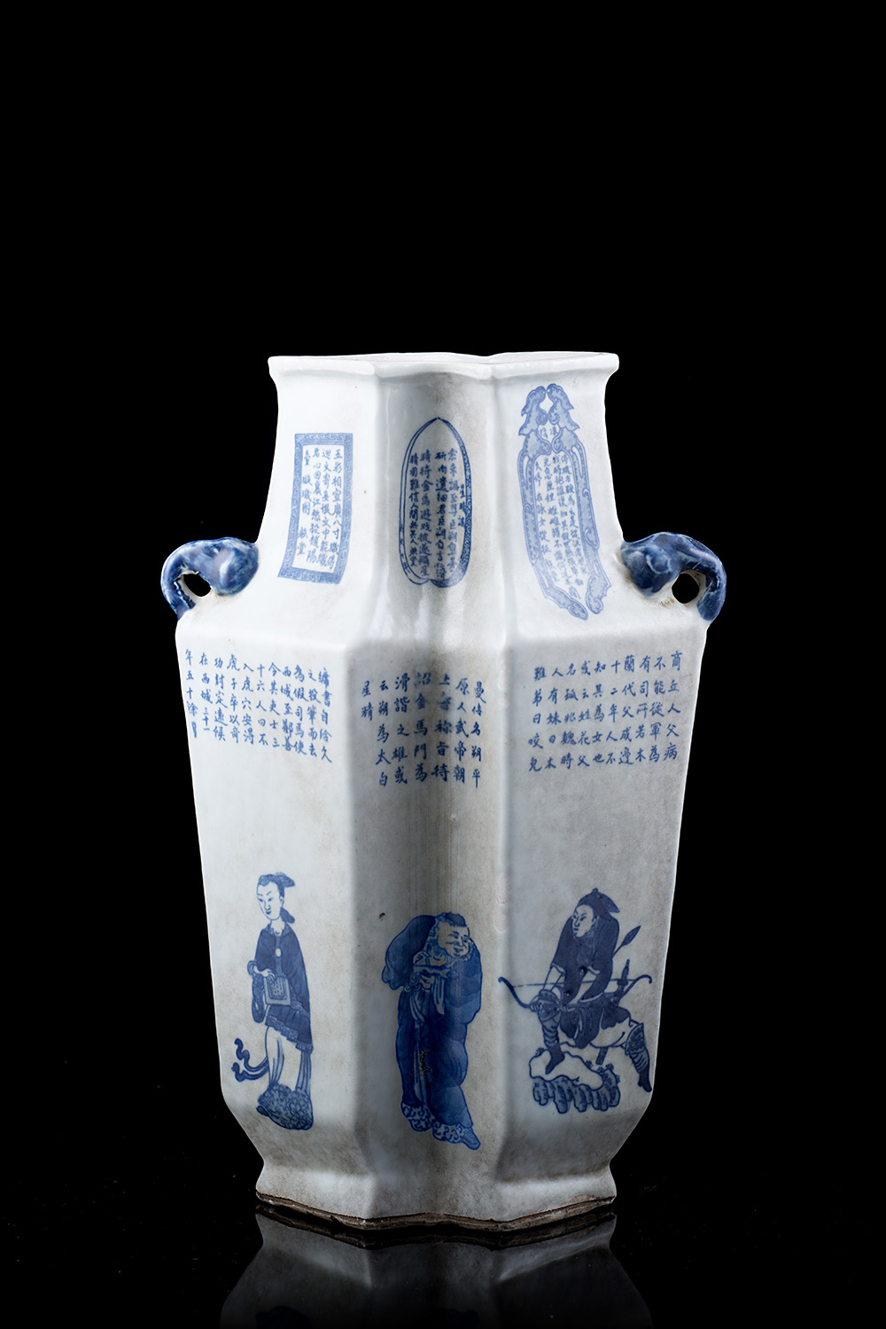 Vaso biansato in porcellana bianca e blu di forma geometrica allungata, con doppie anse a guisa di elefante, decorato con scene tratte dallo Wu Shuang Pu