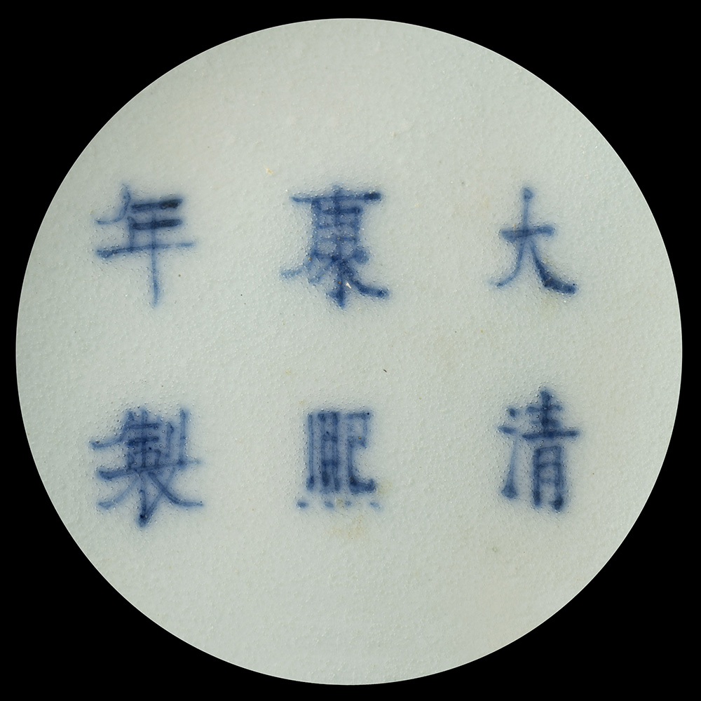 Vaso dal corpo schiacciato con invetriatura celadon e macchia violacea, marchio apocrifo Kangxi alla base