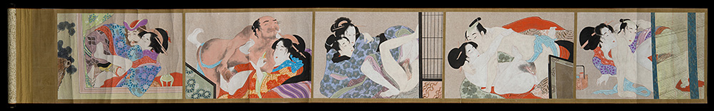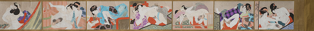 Twelve erotic-subject woodblock prints, ink and colours on paper, mounted in a scroll (slight defects)