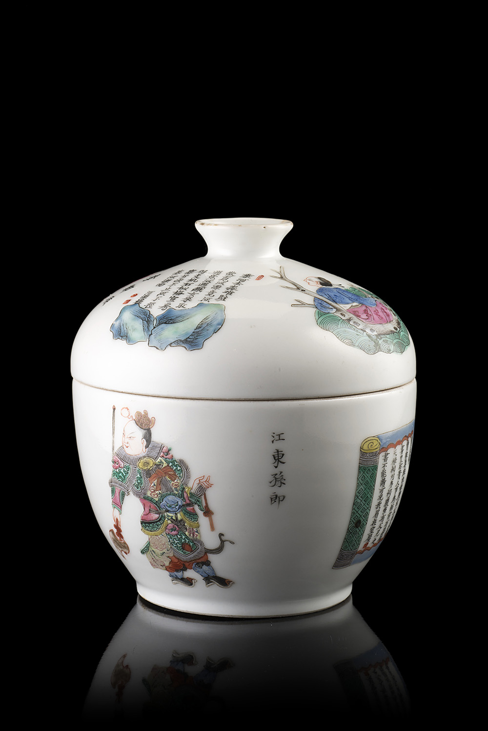 Ciotola con coperchio in porcellana Famiglia Rosa decorata con personaggi dello Wu Shuang Pu (difetti)