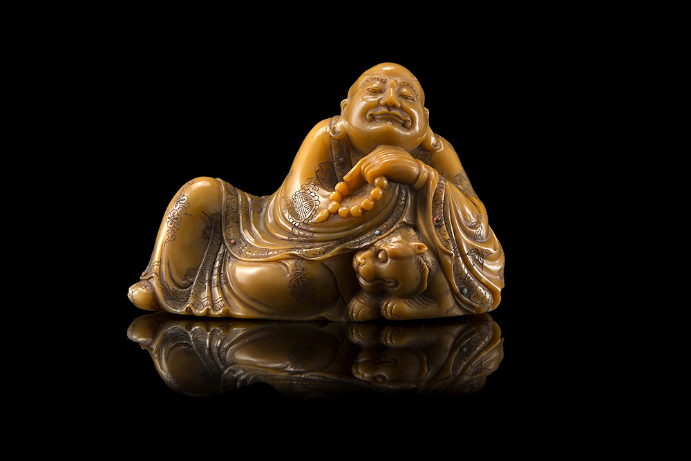 A soapstone model of a luohan in half-seated position, accompanied by a tiger