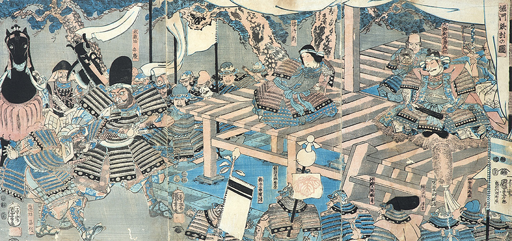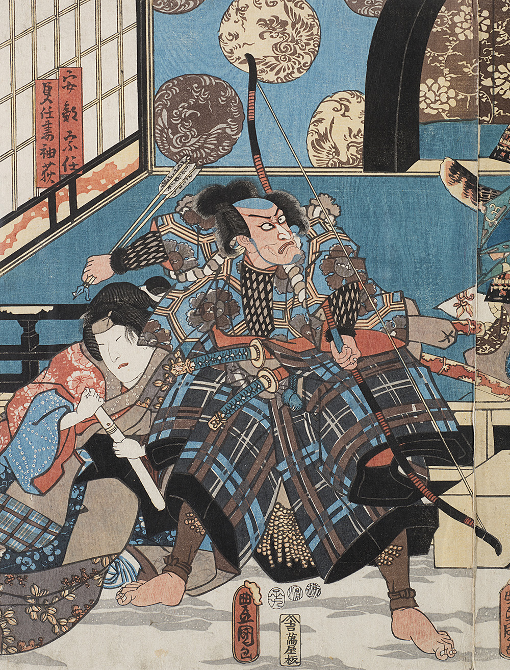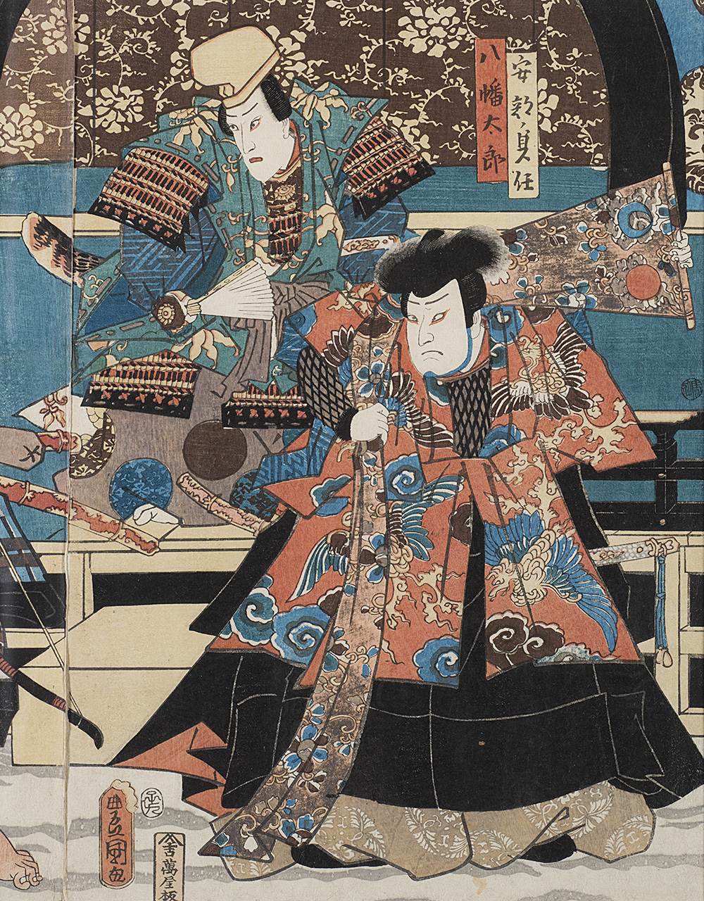 Un trittico firmato Kuniyoshi e una stampa raffiguranti scene teatrali, in cornice