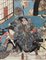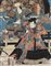 Un trittico firmato Kuniyoshi e una stampa raffiguranti scene teatrali, in...