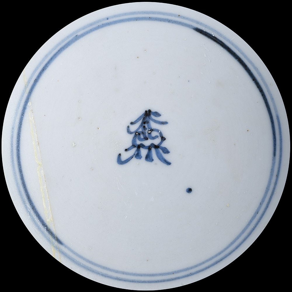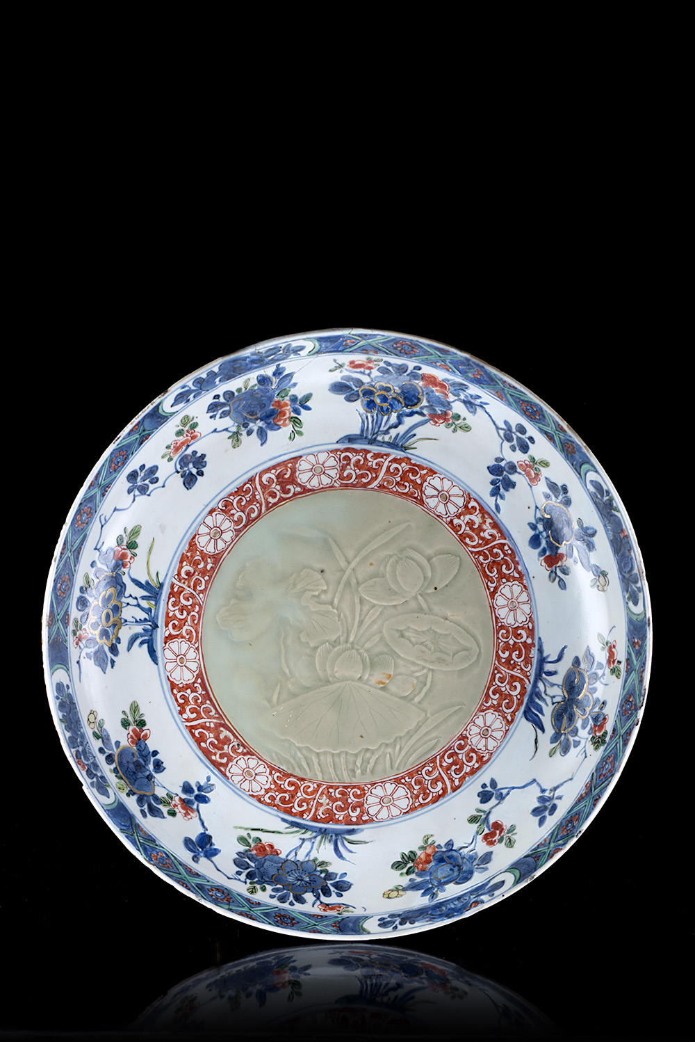 Piatto in porcellana bianca e blu, rosso ferro e celadon al centro decorato...
