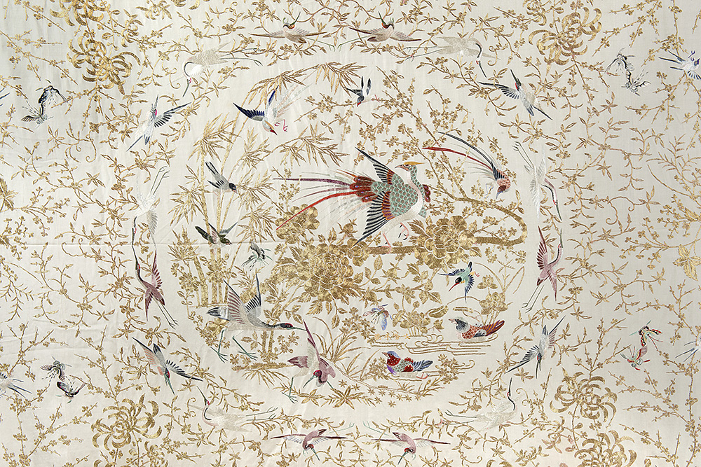 Arazzo in raso di seta bianco ricamato in seta policroma ed applicazioni di filo decorato con coppie di volatili in volo tra peonie e rami fioriti