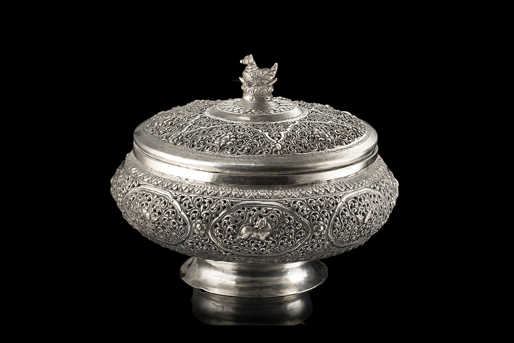 Scatola con coperchio circolare in argento cesellato e sbalzato decorata con...