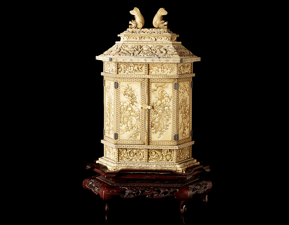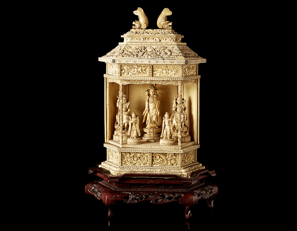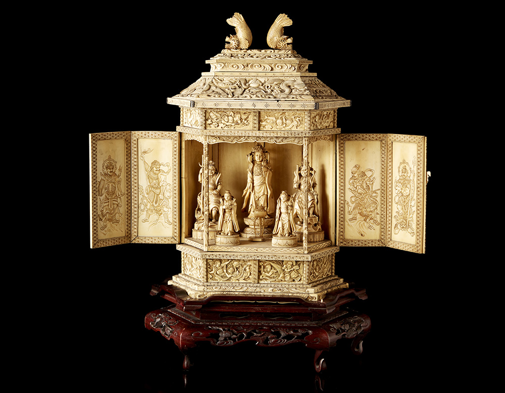 Tempio in avorio contenente sculture di Kannon, guardiani e servitori,...