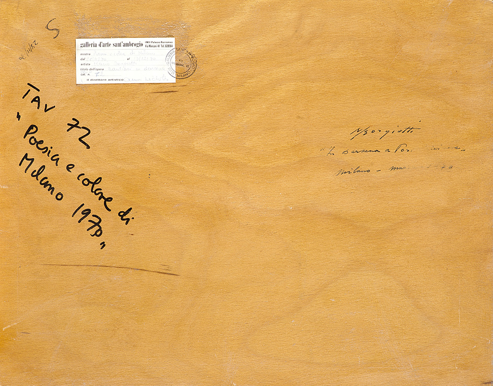 1970, "Poesia e colore di Milano" Galleria d'Arte Sant'Ambrogio, Milano. Cartiglio e timbro al retro