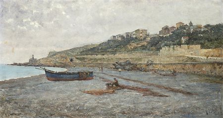 Lorenzo Gignous (Modena 1862 - Porto Ceresio 1958)"Paesaggio costiero" olio...