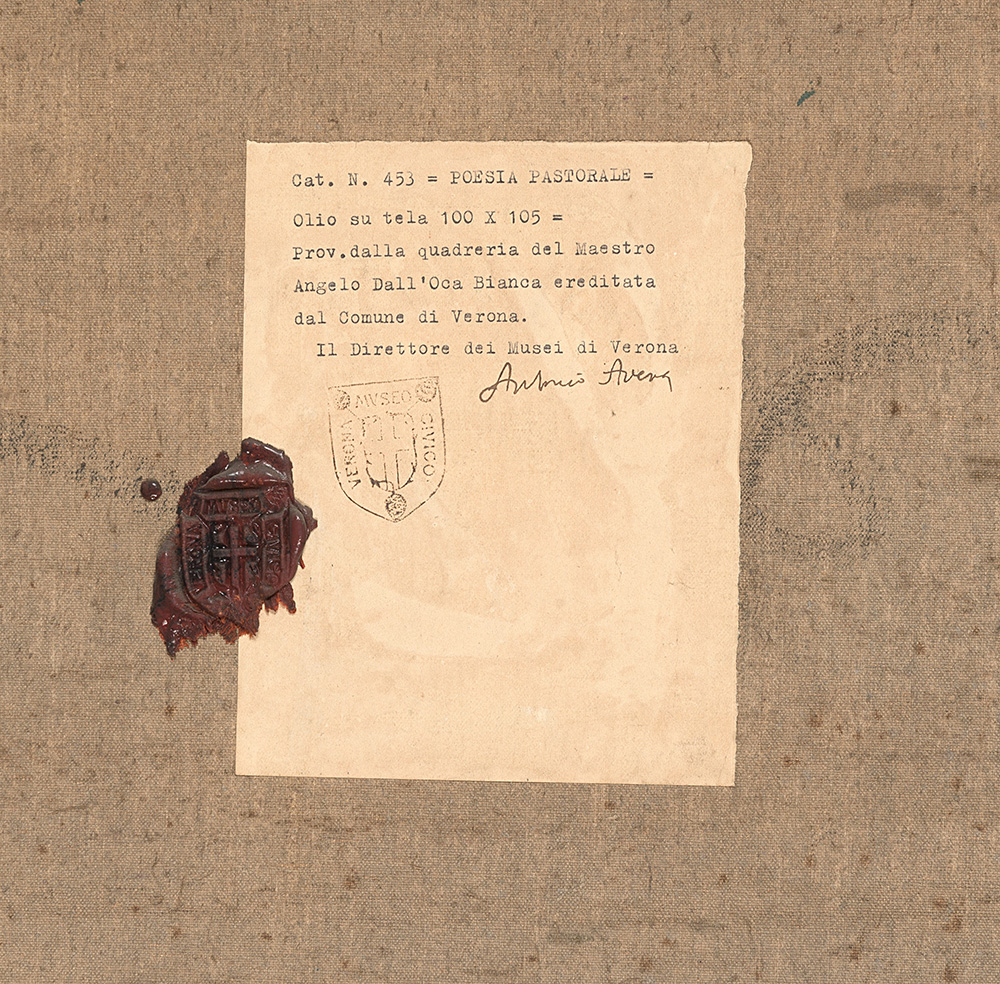 Al retro: cartiglio e timbro a ceralacca del Museo Civico di Verona firmato dal dott.Antonio Avena