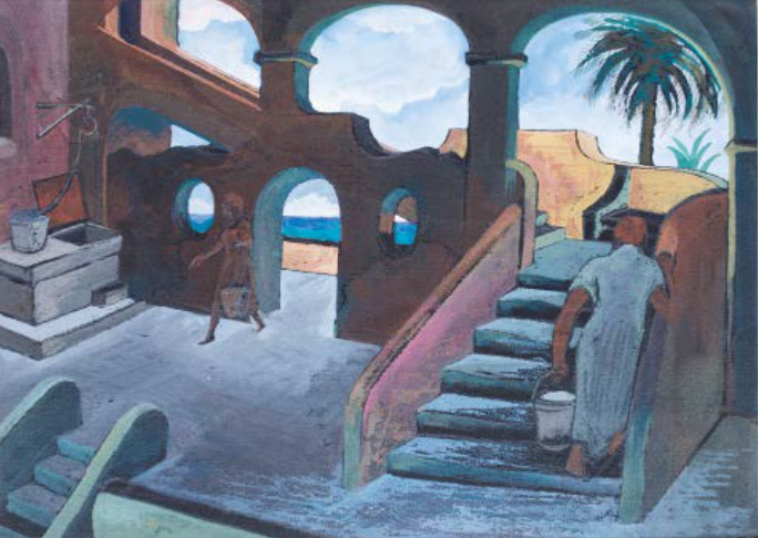 THAYAHT (PSEUDONIMO DI ERNESTO MICHAHELLES) Firenze 1893 – Marina di Pietrasanta 1959 SCENOGRAFIA TEATRALE, ANNI ‘30 tempera su cartoncino nero, cm 25,4x34,8. Bibliografia: A. Panzetta, Thayaht e Ram, Ed. XX Secolo, Bologna 2006, p. 105 (ill.)