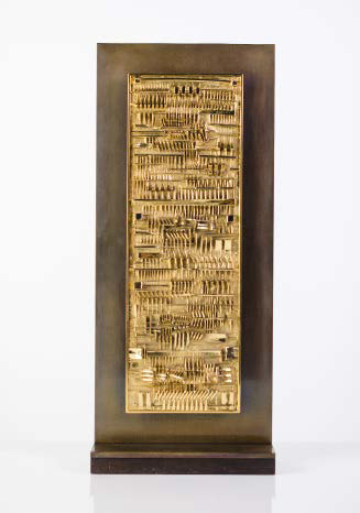 ARNALDO POMODORO Morciano di Romagna 1926 STUDIO, 1960 ottone dorato, ottone e legno, cm 51x22x10. Firmato e numerato alla base: Arnaldo Pomodoro 3/3. Provenienza: Dubai, Christie’s, 30 ottobre 2008, International Modern and Contemporary Art, p. 107; Bibliografia: F. Gualdoni (a cura di), Arnaldo Pomodoro. Catalogo ragionato della scultura, Skira editore, Milano, 2007, n. 172, p. 435 (ill.). Opera archiviata presso la Fondazione Arnaldo Pomodoro con il numero: AP 132b; realizzata in tre esemplari più una prova d’artista