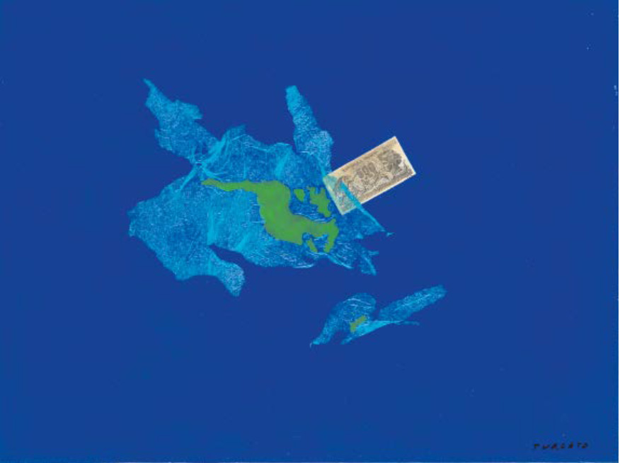 GIULIO TURCATO Mantova 1912 – Roma 1995 COLLAGE CON BANCONOTA tecnica mista e collage su tela, cm 60x80. Firmato in basso a destra: Turcato. Firmato e dedicato al verso: Turcato a Rolando. Provenienza: Livorno, Galleria Giraldi; Terni, Collezione giancarlo Tonelli. Opera accompagnata da autentica dell’artista su fotografia. Repertorio C4941631239-r Post