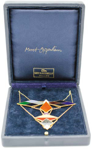MERET OPPENHEIM Berlino 1913 - Basilea 1985 COLLANA “TETE DU POETE” in oro e smalti policromi. Firmata e numerata: Meret Oppenheim 1967 4/9. Il modello fu disegnato nel 1967 e poi realizzato da Gem Montebello su autorizzazione dell’artista nel 1977 in una serie di 9 esemplari più una prova d’artista. Bibliografia: D. Venet, From Picasso to Jeff Koons: The Artist as Jeweler, catalogo dell’esposizione, Museum of Art and Design, New York, 2011, p. 191 (ill.)