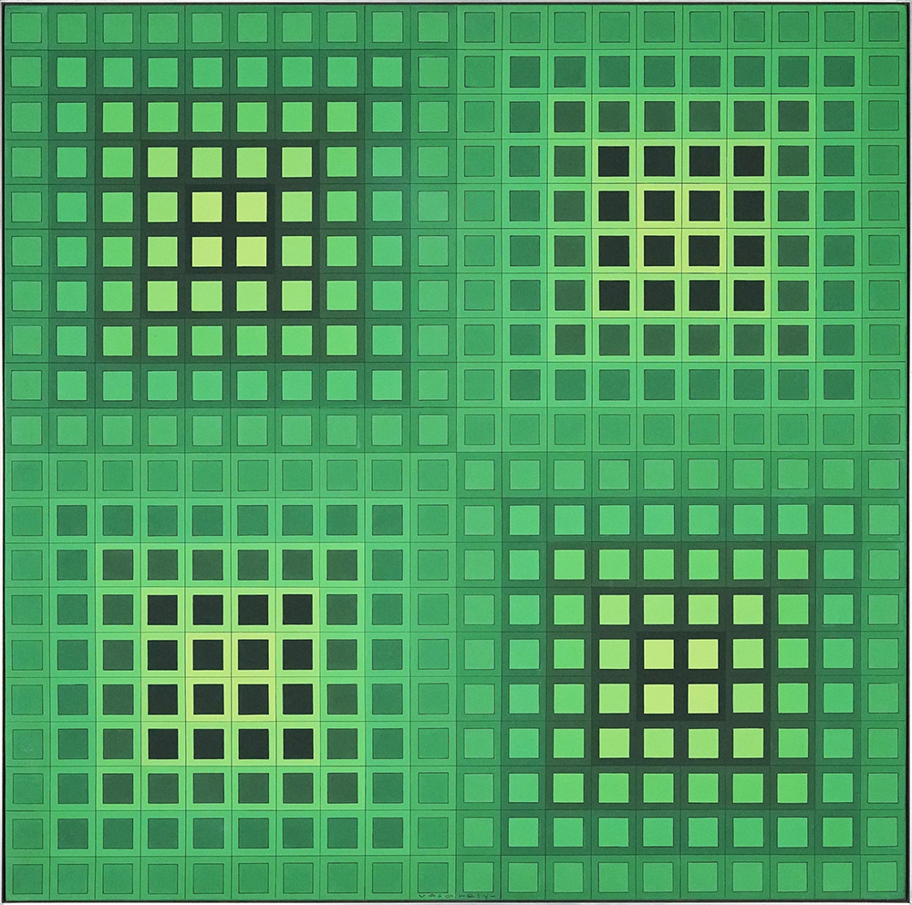 Victor Vasarely Gyep 1965 Tecnica mista su tavola 80 x 80 cm Firmato in basso al centro Firma, titolo, data, misure e n. 0597 sul retro Etichette della Galerie Beyeler, Basilea sul retro