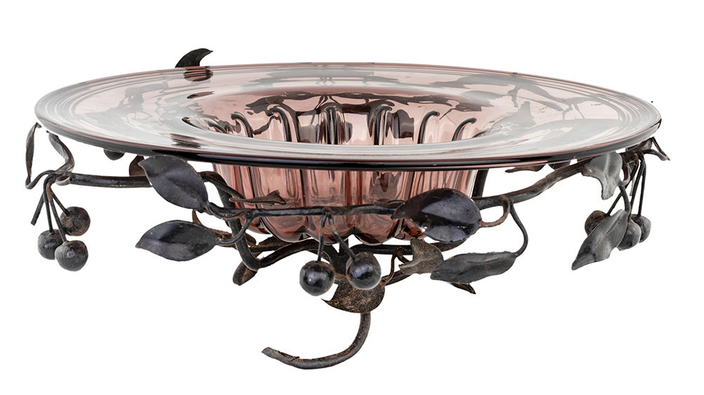 MURANO ITALIA1940 ca. PIATTO IN VETRO di colore viola sorretto da una struttura in ferro battuto a forma di ramo di ciliegio, diametro cm 40