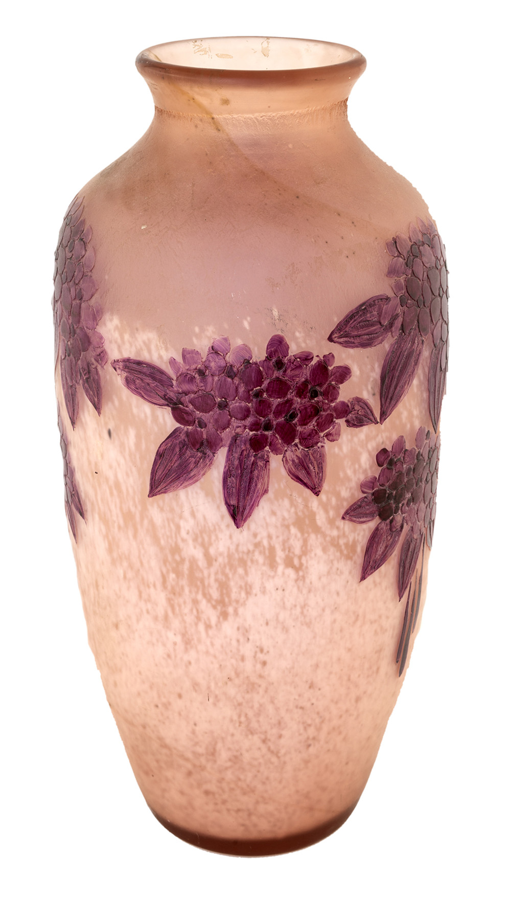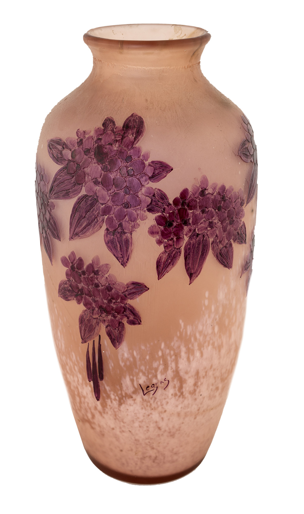 LEGRAS FRANCIA1940 ca. VASO in vetro a cammeo serie "rubino" con decoro floreale, nei toni di rosa e rosso amaranto. altezza cm 40, firma a lato