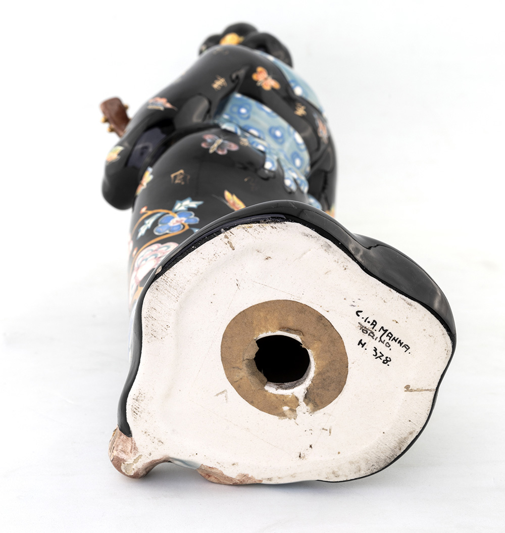 C.I.A MANNA TORINO 1950 ca. GEISHA figura di donna giapponese con chitarra, terraglia a colaggio, decoro a mano policromo. Firma sotto la base con numerazione 378 altezza cm 44