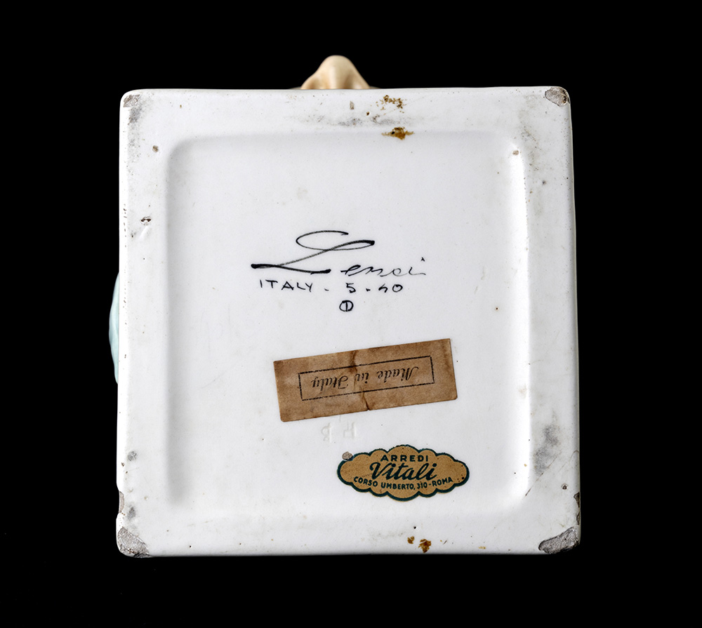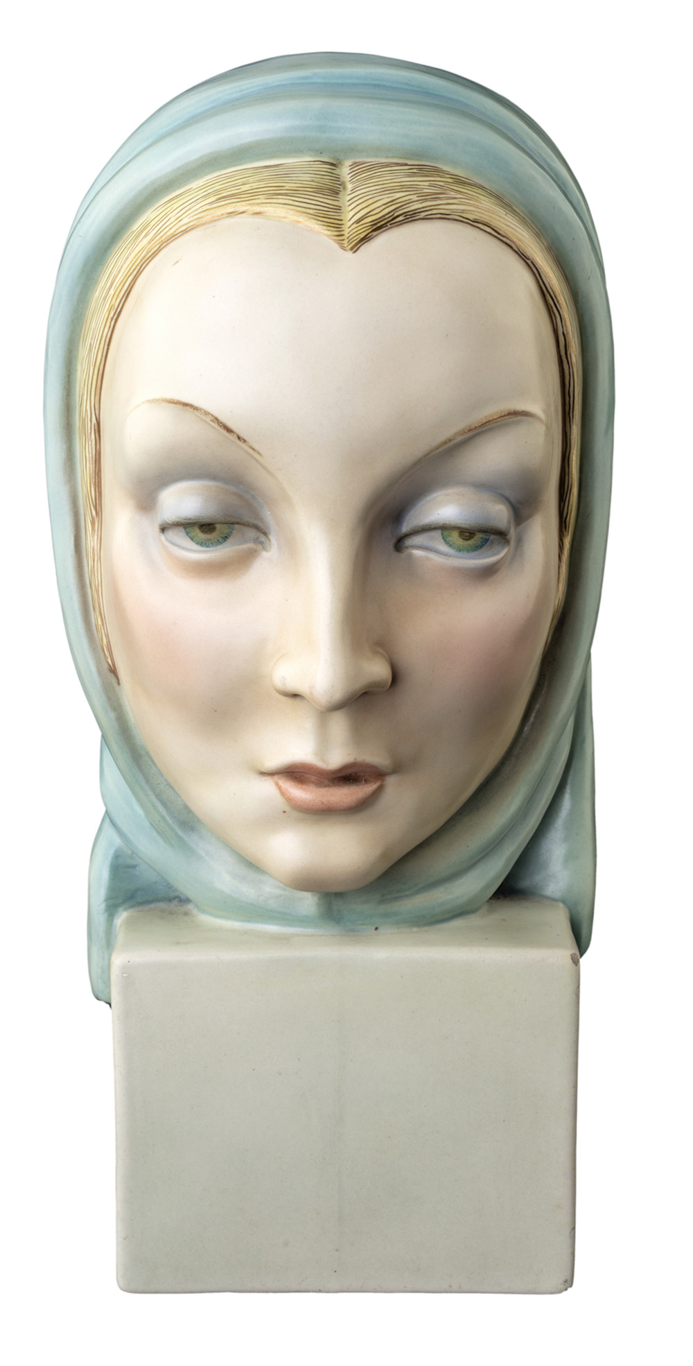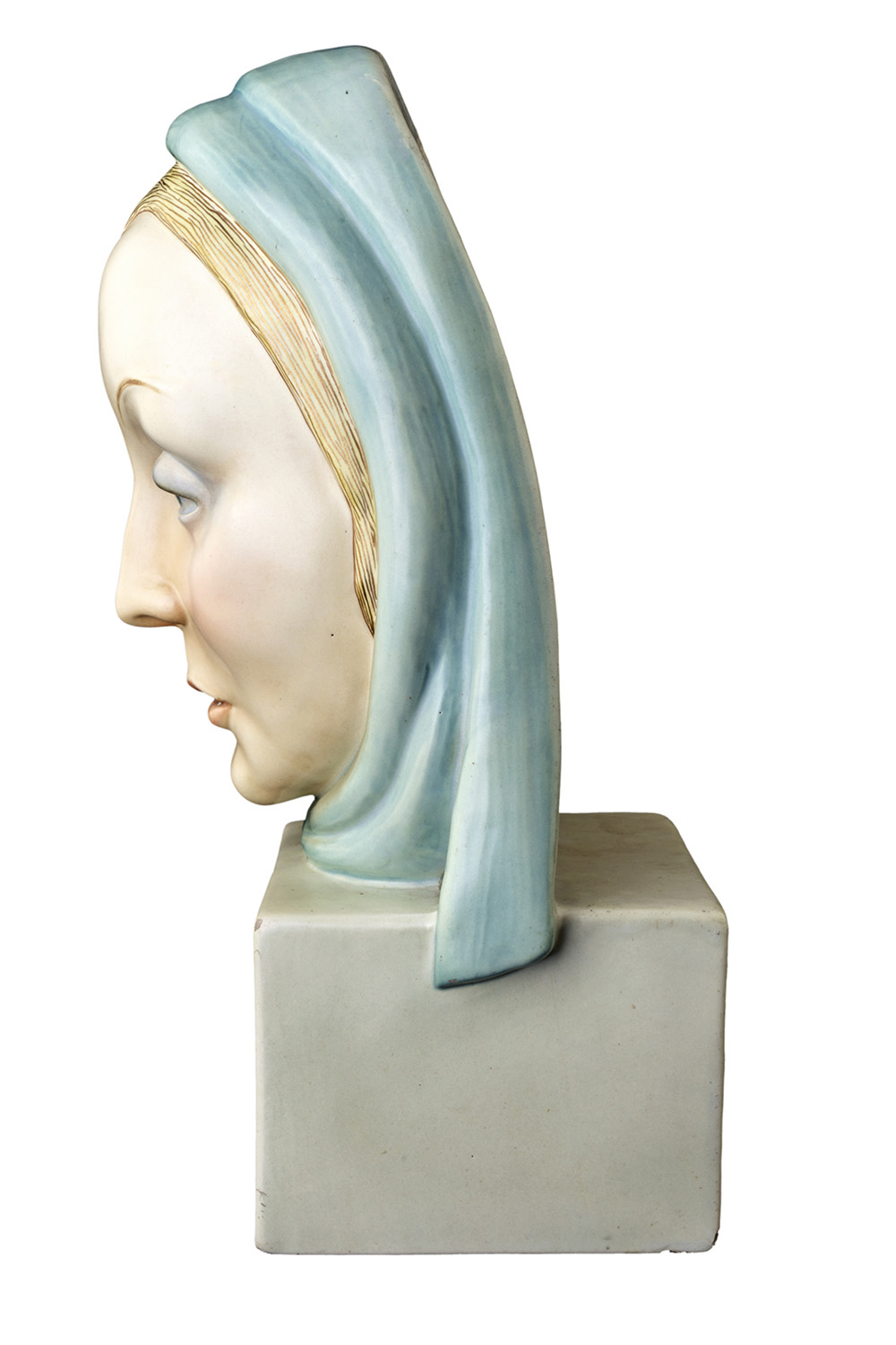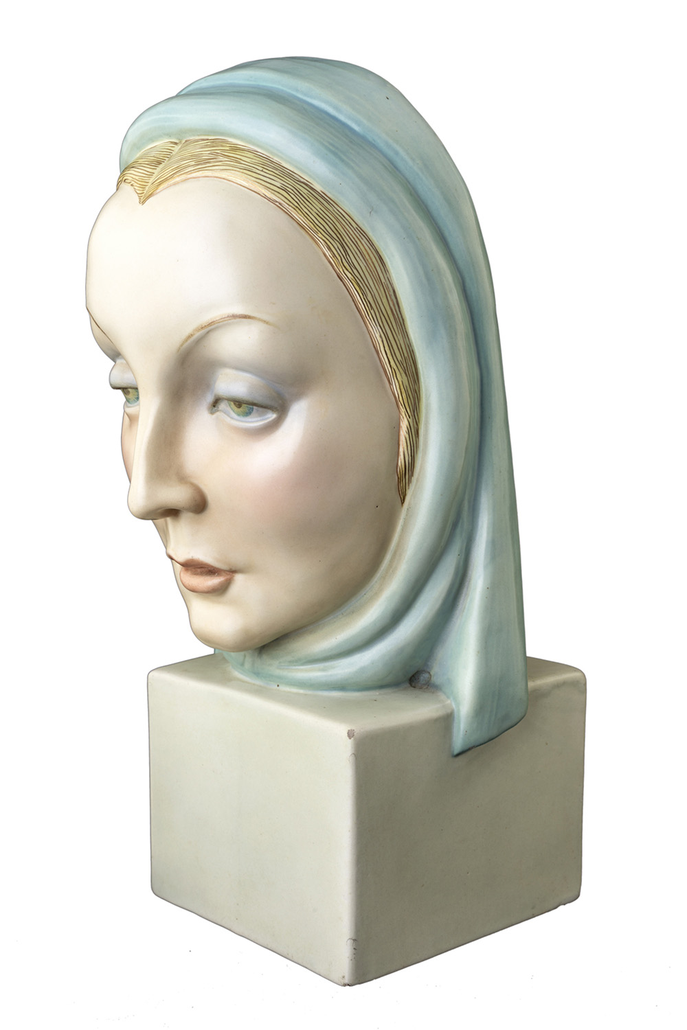 ELENA KONIG SCAVINI LENCI, TORINO 1930 ca. TESTA DI DONNA CON FOULARD in terraglia a colaggio, decoro a smalto policromo, marchio sotto la base con targhette originali dell'epoca e firma incisa Elena Konig Scavini. altezza cm 30, base cm 12