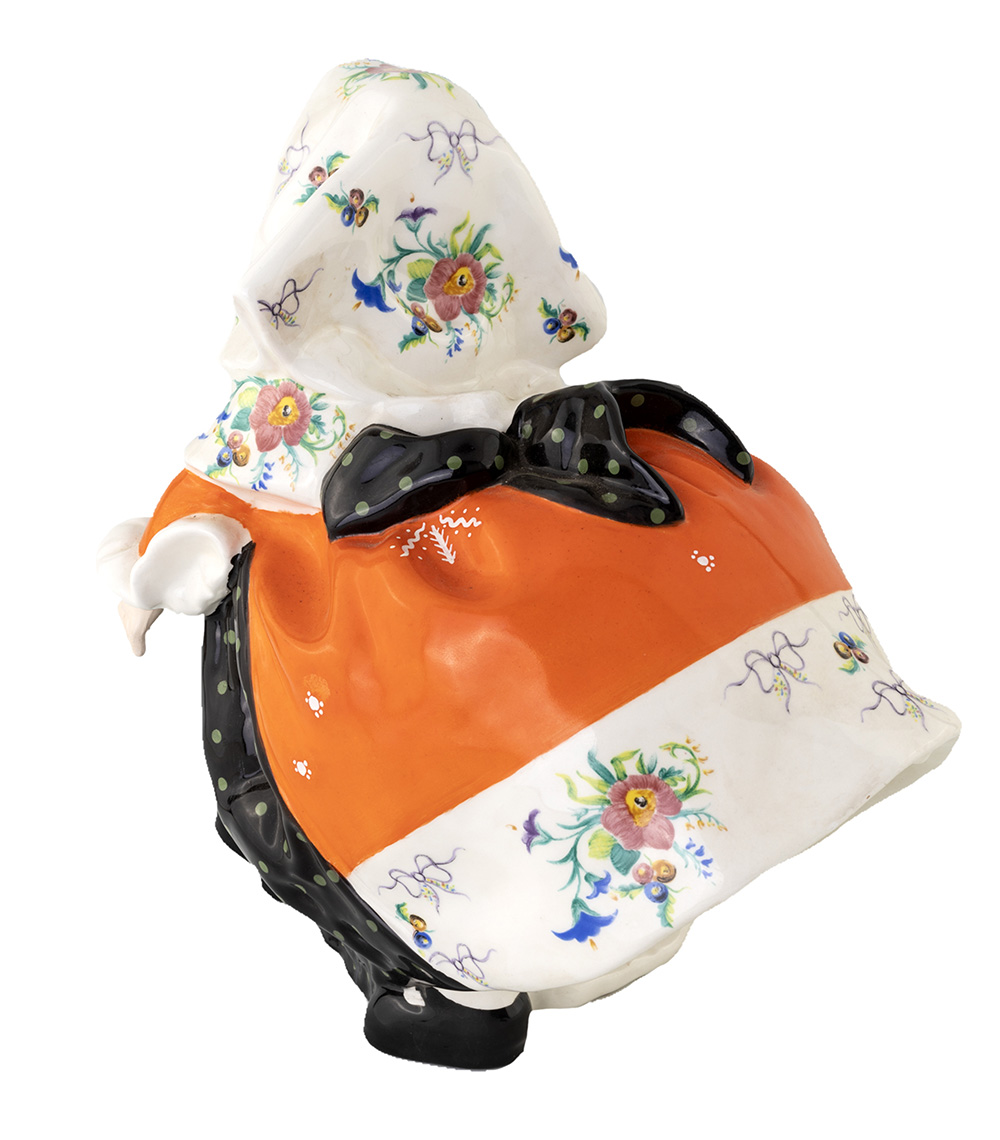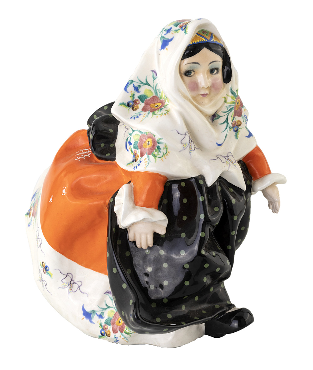 SANDRO VACCHETTI ESSEVI, TORINO 1940 ca. BAMBINA SARDA figura di bambina con tipico costume sardo ceramica policroma, modellata a colaggio,1940 ca altezza cm 38. Marcata sotto la base con numerazione 254