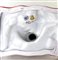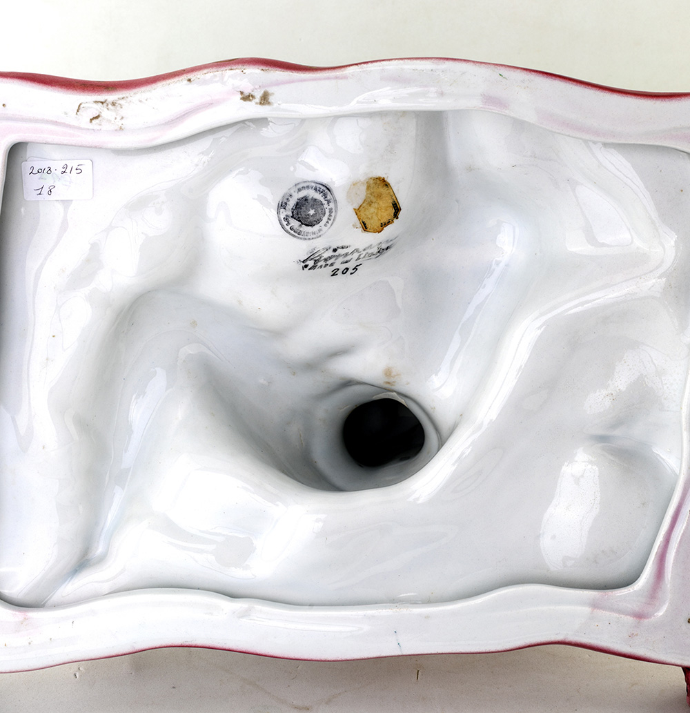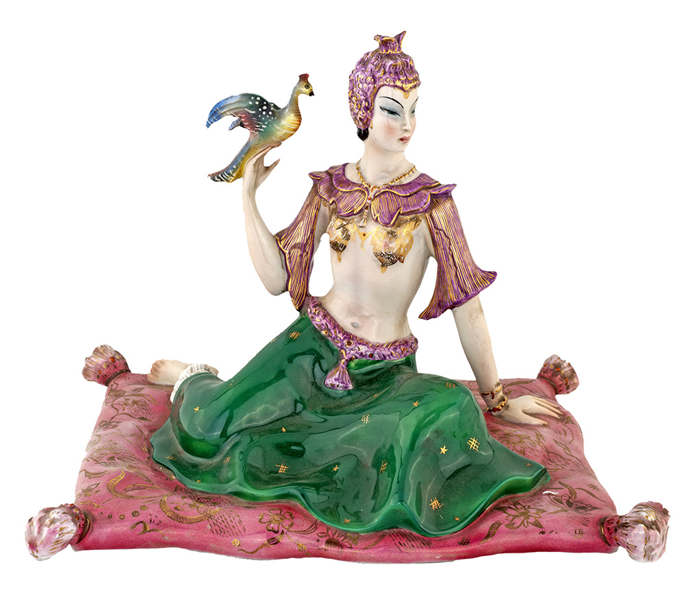 RONZAN TORINO 1950 ca. ODALISCA figura di giovane odalisca con colomba,seduta su soffice cuscino. Ceramica smaltata, decoro policromo e oro. Marcata con numerazione 205 e timbro del Ministero dell'Industria, altezza cm 28, base cm 36