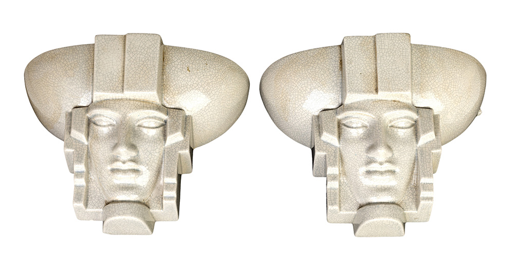 PRODUZIONE FRANCIA 1930 ca. "TESTE DI FARAONE " coppia di fioriere da muro Art Deco' in ceramica craquelet, cm 23x32