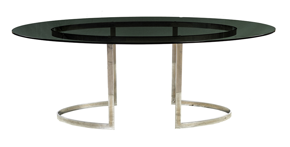 VITTORIO INTROINI 1970 TAVOLO CONSOLLE base acciaio, top in vetro fumè verde, forma ellittica, prod. Saporiti cm. 70x190x80