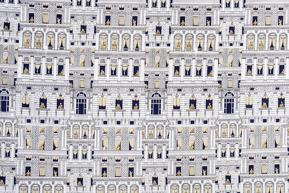 FORNASETTI 1980 TESSUTO con disegni di personaggi in finestra, rasatello di cotone, lunghezza 10 metri, altezza cm 280