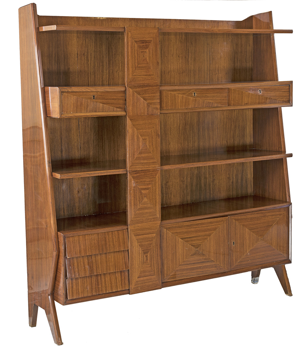 PAOLO BUFFA 1950 (ATTR.) LIBRERIA contenitore in palissandro, cassetti e sportelli bugnati. Ripiani a giorno cm 171x156x41