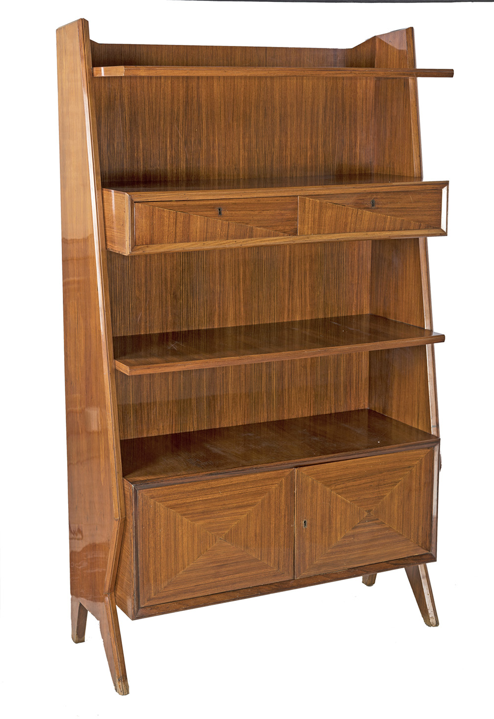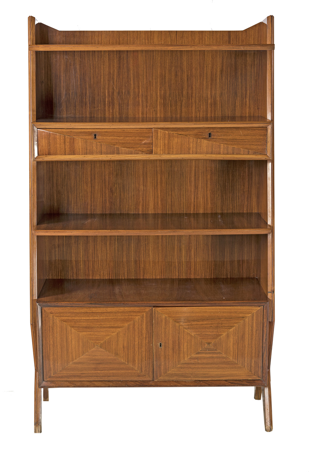 PAOLO BUFFA 1950 (ATTR.) LIBRERIA in palissandro, cassetti e sportelli bugnati, ripiani a giorno. Attr. P.Buffa, cm 171x100x41