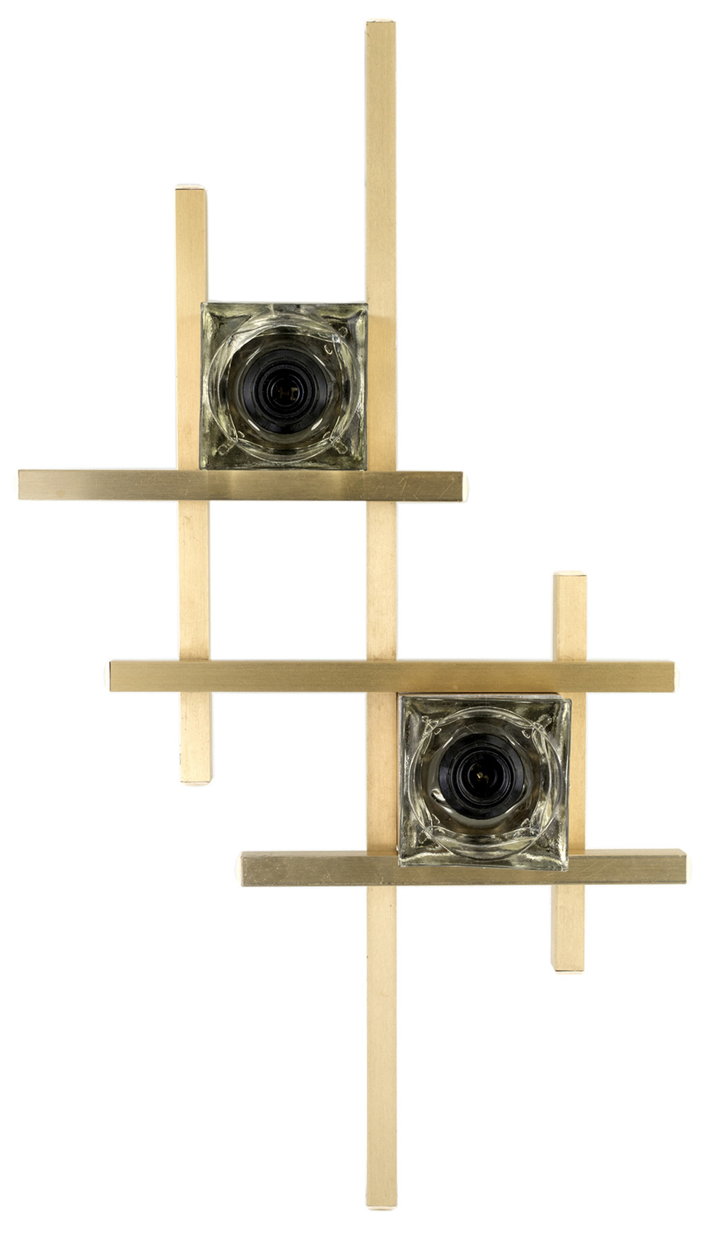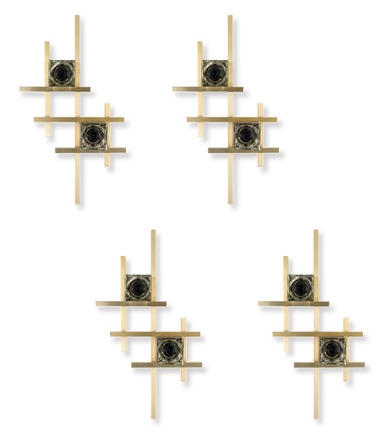 GAETANO SCIOLARI 1970 APPLIQUE quattro appliques "cubic", a forma di parallelepipedi in metallo dorato con inserti di vetro, cm 60x33. Prod Sciolari Italia