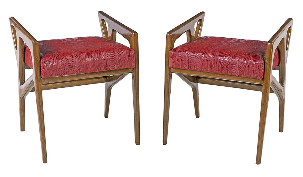 GIÒ PONTI 1950 COPPIA DI SGABELLI struttura in noce, rivestimento in ecopelle, produzione Italia cm 54x46x42.