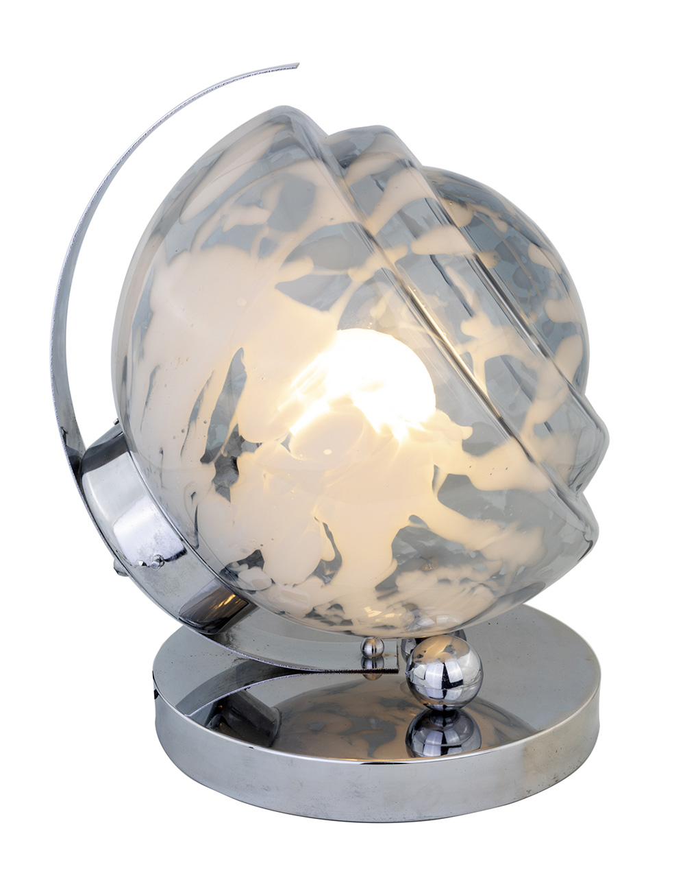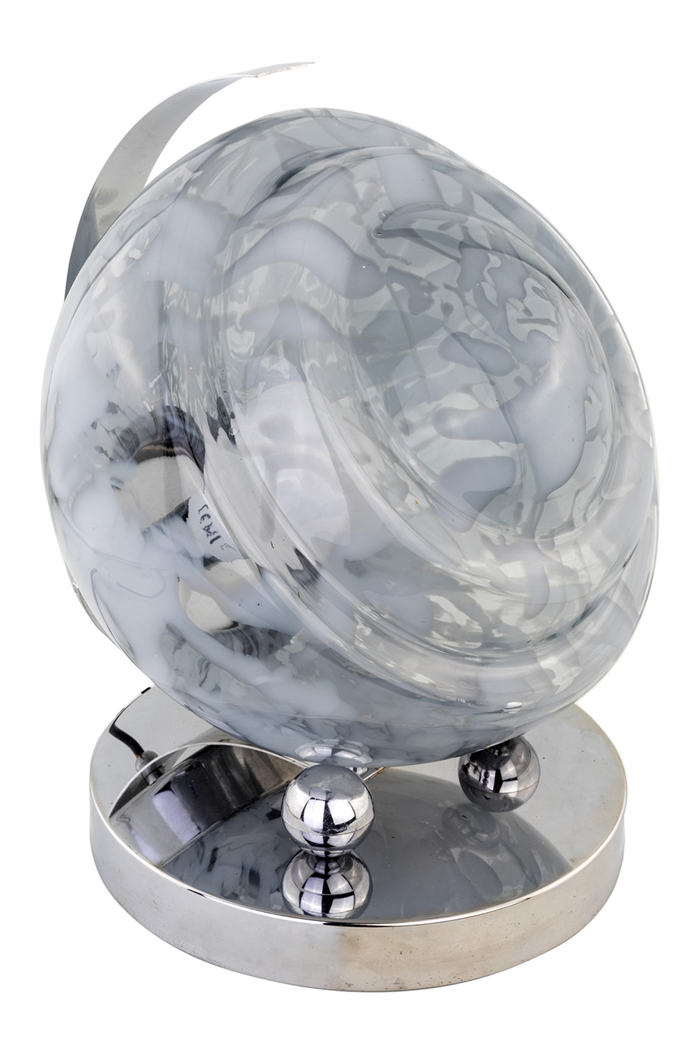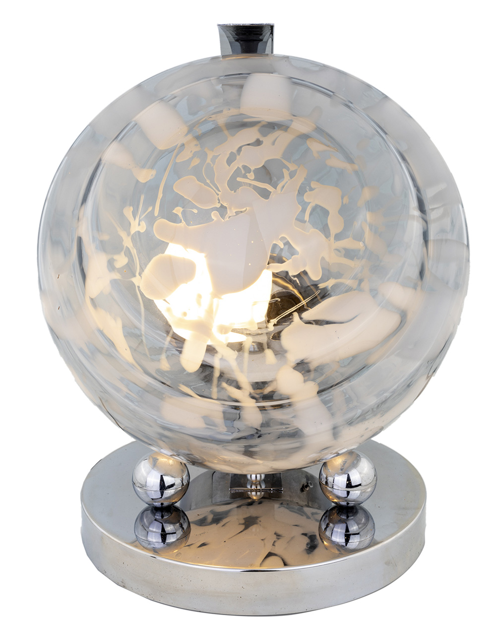 NASON 1970 ca. LAMPADA DA TAVOLO a forma di mappamondo in vetro soffiato bombato con striature di bianco lattimo sorretto da una struttura in acciaio lucido, cm 42x30
