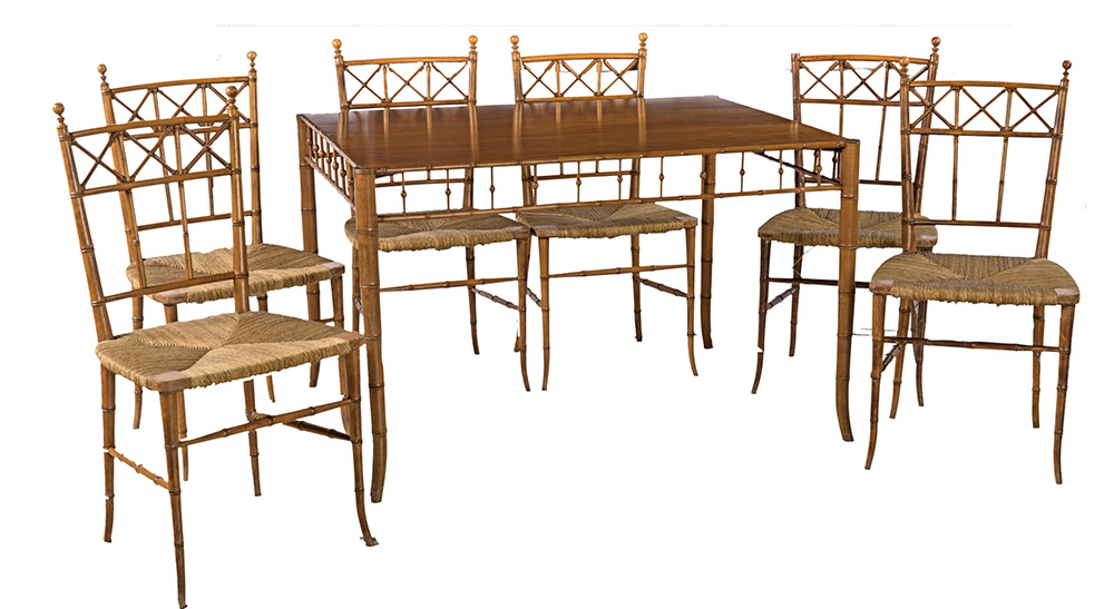 FRANCIA XX SECOLO TAVOLO E SEI SEDIE con lavorazione intaglio finto bambù,...