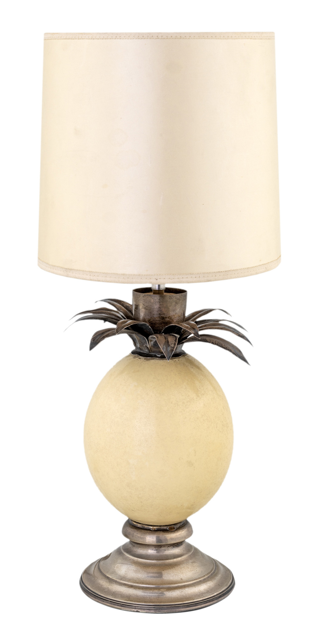 PRODUZIONE ITALIANA LAMPADA DA TAVOLO a forma di ananas con uovo di struzzo e argento 1970 ca, altezza cm 27