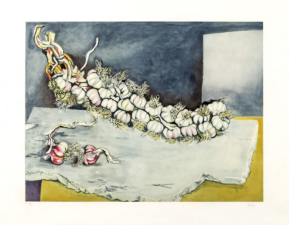 RENATO GUTTUSO (Bagheria 1911-Roma 1987) TRECCIA D'AGLIO litografia, 91x110 cm. Firma e numerazione sul fronte "H.C. 12/18 ; Guttuso". Pubblicazioni: Renato Guttuso, Opere di Grafica 1983-1987, Città di Bagheria, Galleria Comunale d'Arte Moderna e Contemporanea - Villa Cattolica.