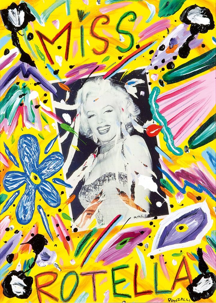 DONZELLI BRUNO Napoli 1941 "Miss Rotella" 70x50 acrilici e collage su tela...