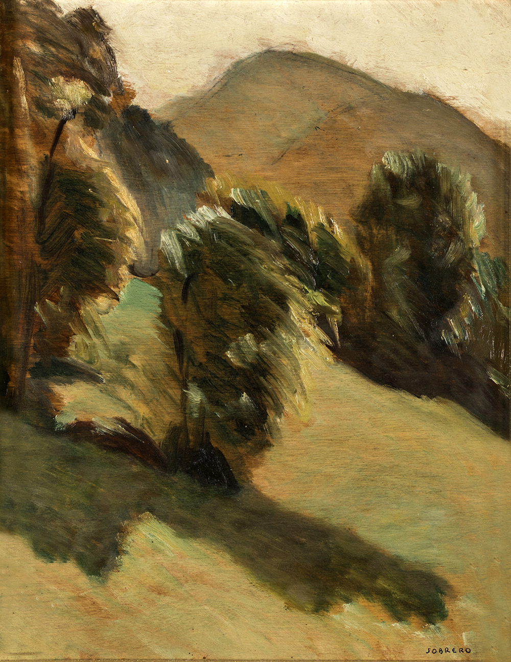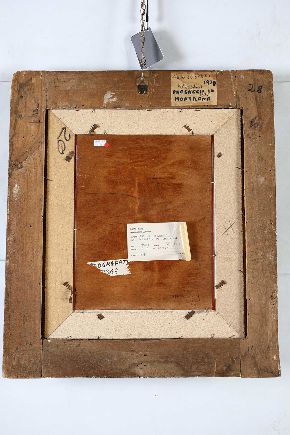 EMILIO SOBRERO (Torino 1890-Roma 1964) PAESAGGIO IN MONTAGNA olio su tavola, cm 40x30,5 firma in basso a destra Sobrero. Opera eseguita nel 1959. Sul retro Cartiglio dell'associazione culturale BREAK - Roma. Provenienza Collezione Alderighi, Roma