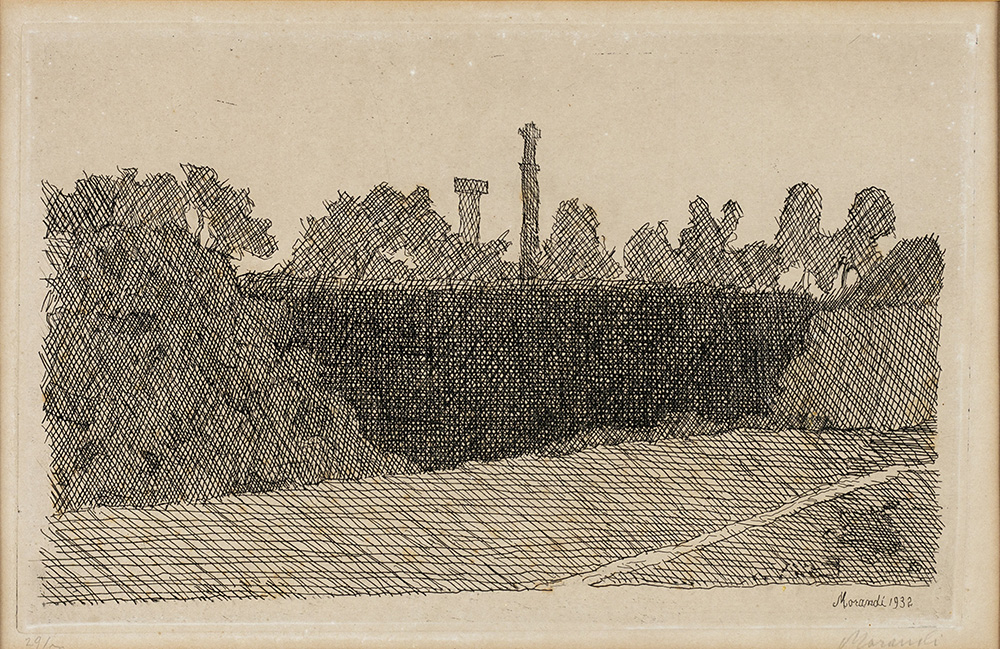 GIORGIO MORANDI (Bologna 1890-Bologna 1964) VEDUTA DELLA MONTAGNELLA DI BOLOGNA incisione, 21x33 cm (dimensione lastra) 33x48.5 cm (dimensione foglio). Firma su lastra "Morandi 1932". Firma e numerazione su foglio "Morandi 29/50". Sul retro reca timbro della Galleria d'Arte Santa Croce (Firenze). Provenienza Collezione Pincherle, Roma
