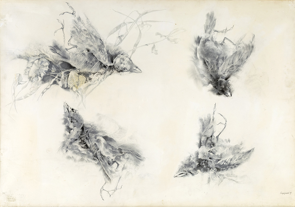 RENZO VESPIGNANI (Roma 1924-Roma 2001) UCCELLI tecnica mista su cartoncino applicata su tela, cm 72x102. Firma sul fronte "Vespignani 1969". Sul fronte timbro Schoelleshammer Schutzmarke.