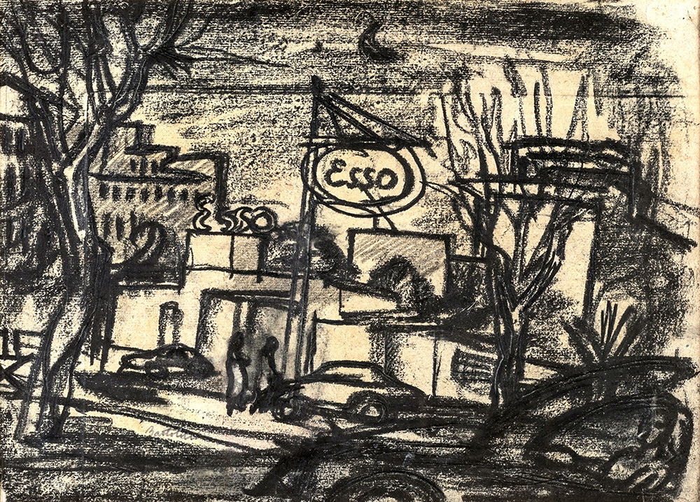 LUIGI BARTOLINI (Cupramontana 1892-Roma 1963) DISTRIBUTORE DI BENZINA ESSO carboncino su carta, cm 28x38. Firma "Bartolini" sul fronte.