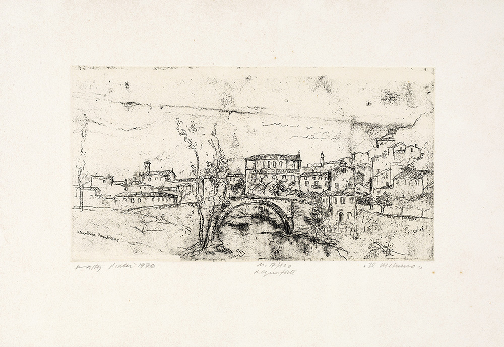 WALTER PIACESI (Ascoli Piceno 1929) IL METAURO (FOSSOMBRONE) acquaforte, cm 34x49. Firma data sul fronte "Walter Piacesi 1976, 17/100". Sul retro Timbro della Galleria Il Selvaggio, Roma.
