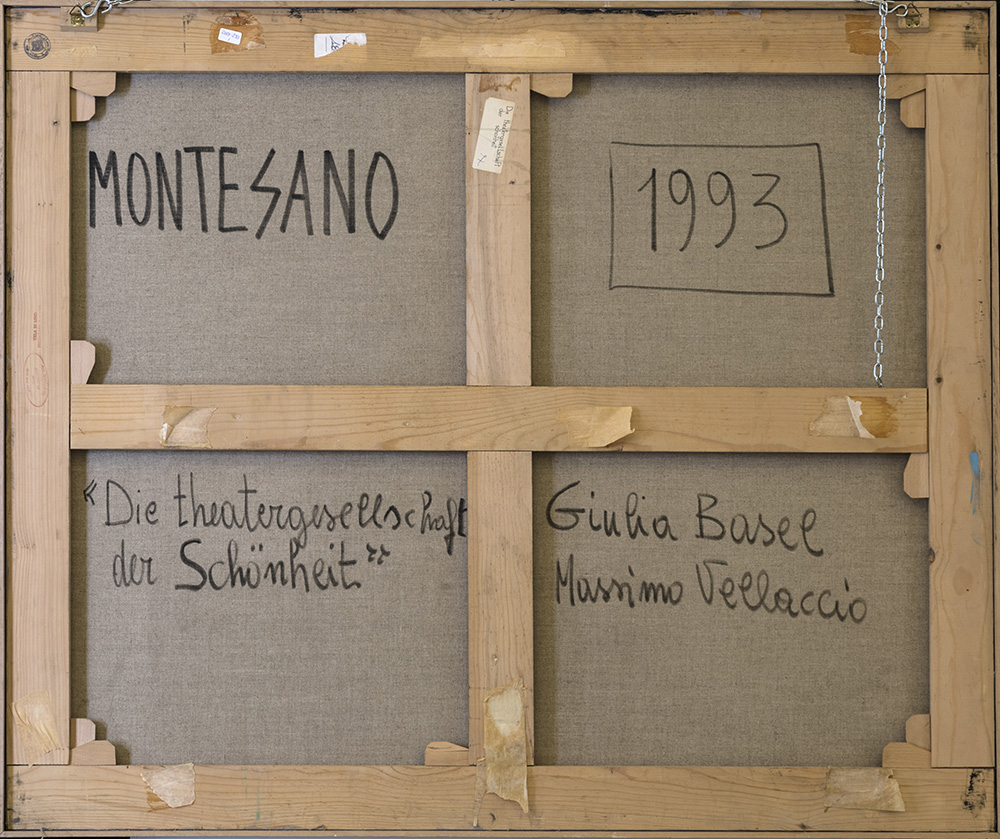 GIAN MARCO MONTESANO (Torino 1949) DIE THEATERGESLLSCHAFT DER SCHONHEIT olio su tela, cm 100x120. Firma e data sul retro "Montesano 1993".