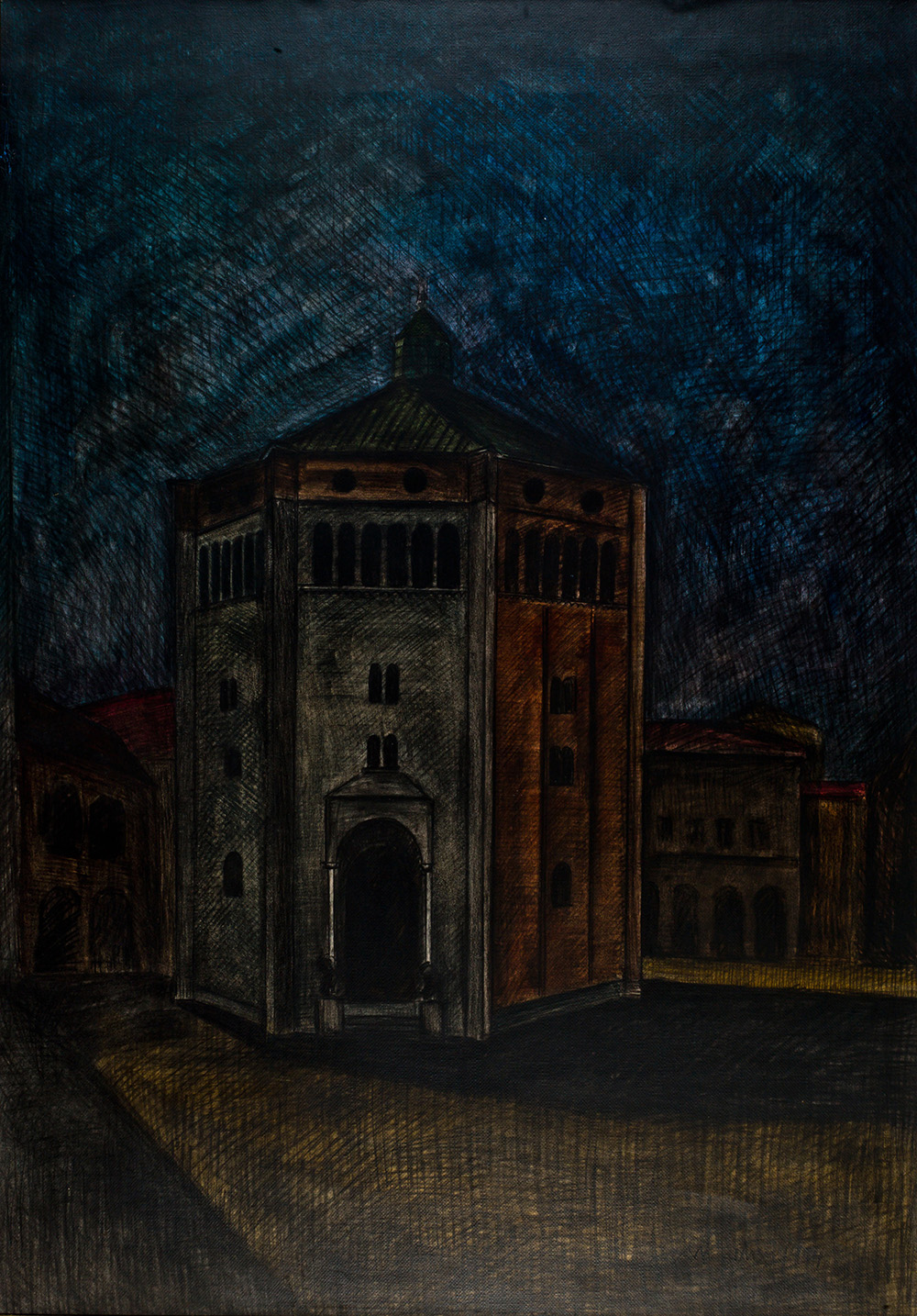 MARCO PETRUS (Rimini 1960) BATTISTERO tecnica mista su carta intelata, cm 100x70, firma sul retro "M. Petrus". Ricevuta di acquisto della galleria D.L. Arte (Milano)