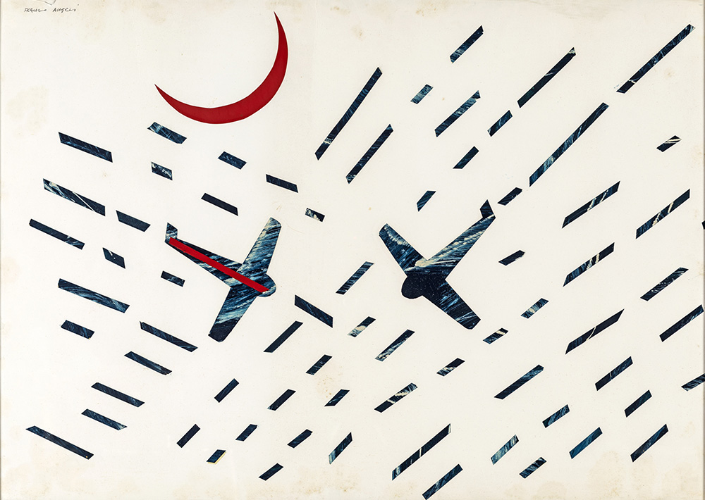 FRANCO ANGELI (Roma 1935-Roma 1988) AEREI olio e collage su cartone, cm 67x94,5. Firma Franco Angeli in alto a sinistra. Opera in corso di archiviazione presso l'Archivio Franco Angeli, Roma